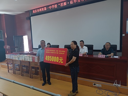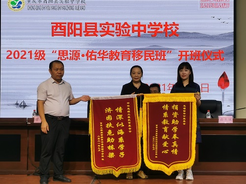 9月9日,民建中央中华思源工程扶贫基金会2021年重庆“思源·佑华教育移民班”“思源·佑华育才班”开班仪式在酉阳县举行。民建重庆市委会二级巡视员吕洁代表民建中央中华思源工程扶贫基金会,向酉阳实验中学“思源·佑华教育移民班”、酉阳一中“思源·佑华育才班”捐赠项目资金共79.5万元,市委会社会服务处处长曾畅代表民建市委会向两个班的学生捐赠1万元的书籍。酉阳县教委副主任田玉良主持开班仪式,县委统战部副部长、县统一战线服务中心主任冯华参加仪式。