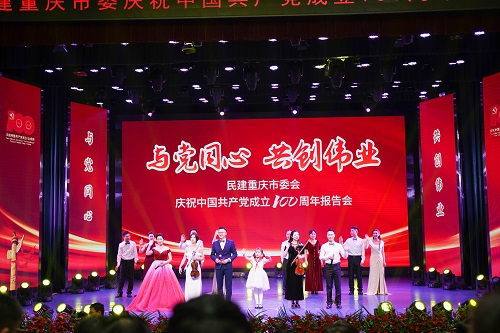 “回顾民建选择接受中国共产党的领导,坚定不移跟党走的历程,总是让人想起一本书——《延安归来》。它犹如一盏明灯,在咱们全国民族工商业身陷困境之时,给人以振奋人心的力量。”随着话剧《延安归来》振奋人心的台词响起,“与党同心 共创伟业 民建重庆市委会庆祝中国共产党成立100周年报告会”拉开了帷幕。