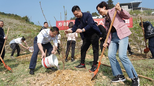 新绿初绽的巴岳山下春意萌动,一片生机盎然景象。山坡上,一株株桃树苗分散开来,等待培土浇灌。重庆市人大常委会副主任、民建重庆市委会主委沈金强宣布活动正式启动后,会员们依次领取铁锹和锄头,向着山坡前进。