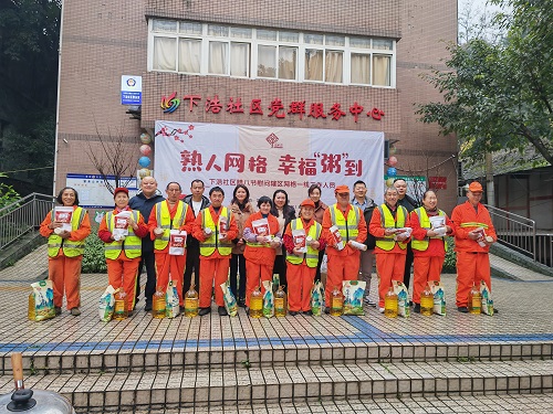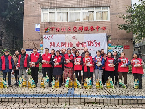 1月22日,在2024年腊八节前一天,迎着蒙蒙细雨,“熟人网格、幸福粥到”慰问活动正式举行,活动由民建南岸十二支部(经开区支部)与龙门浩街道下浩社区共同主办,由下浩社区党群服务中心、下浩社区新时代文明实践站承办。活动中,经开区支部主委陈兴志首先代表支部全体会员发言,他表示,龙门浩街道下浩社区在采取“熟人网格”城市管理中取得的显著成效,离不开一线环卫工人、劝导员、调解员等社区志愿者的辛勤努力,今后支部还将结合传统佳节开展更多形式多样的爱心慰问活动,为社区服务贡献出自己的一份力量。之后,支部7名会员代表为社区30余名环卫工人、社区网格一线工作人员送上价值1万余元的粮油、腊肉、面食等暖心大礼包,并派发腊八粥,感谢他们的辛勤付出。
