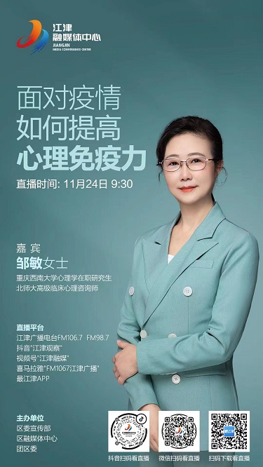 为打赢新冠肺炎疫情歼灭战,江津区全面贯彻落实党中央、国务院疫情防控工作决策部署及重庆市委、市政府工作安排,坚决做到“不忘初心跟党走、齐心协力战疫情”。江津区委书记李应兰强调,抗击新冠疫情是一场人民战争,需要人人出力、人人尽力、人人给力,务必求胜。因此,江津融媒体中心特邀重庆市人大代表、民建江津区委会副主委、恒丰银行江津支行行长、北师大CARE高级心理咨询师邹敏以“面对疫情,如何提高心理免疫力”为主题开展了线上直播课程。
