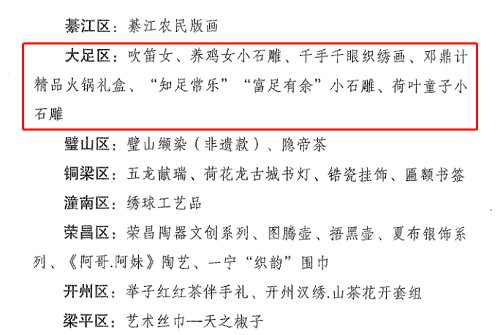 近日,由重庆市文化和旅游发展委员会、市人民政府外事办公室、荣昌区人民政府联合主办的2021“重庆好礼”旅游商品(文创产品)大赛圆满落幕,大足区5件作品入围,其中4件作品为大足民建会员创作。