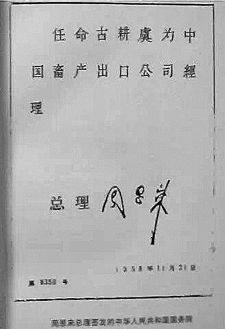 1955年,中国猪鬃公司扩大为中国畜产出口公司,周恩来代表国务院任命古耕虞为总经理。