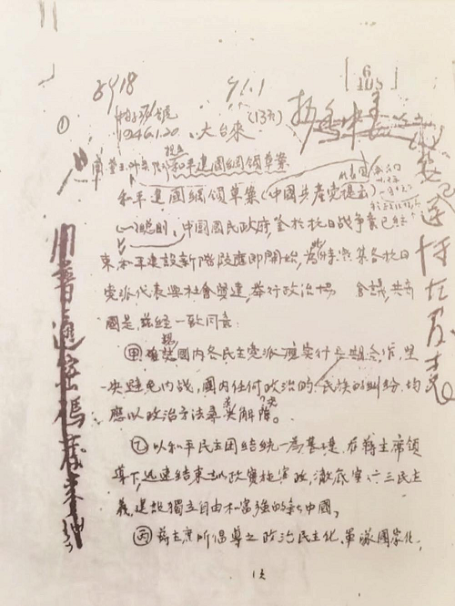 上午,纲领组第八次会,全部复加研讨,增改定稿。时正在国府开会,忽维钧(夫人姚维钧)仓皇来国府门首报告,菁园寓中被军警宪兵特务大搜检,知我已移宿国府路三百号,若辈跟踪将至等语。至已近十二时,我待会务全了,乃起立报告此事,同组内政部长张厉生陪来吾至三百号,则若辈已散。此事发生于上午十一时顷,军警宪各数人持枪把住菁园寓楼门口及楼梯,用枪指吓王姓女佣(王素青)及李姓服务生(学生李国全),逼问黄炎培藏枪所在。乱翻抽屉,打开文件箱前十几口,无所得,迫开锁闭之卧室,任意翻检。时恰送到上海杜月笙给我之电报,即攫取抄录,室有电话,早被把守,禁发禁接,李生乃从窗外招手,嘱邻室中人借电话打给国府路三百号我知,若辈因此得知我所在,即来三百号追寻,维钧乃急走国府告我。