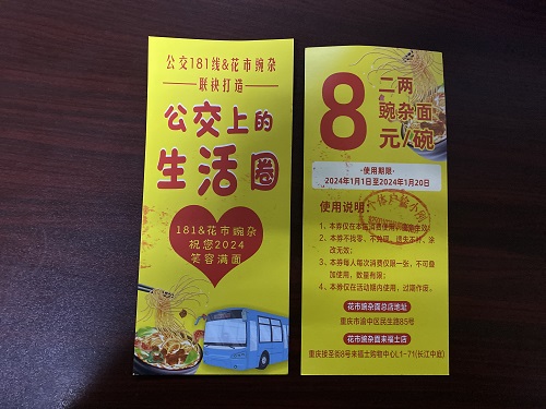 九支部会员、花市豌杂面负责人刘航和公交181线路负责人罗静在结合自身企业优势的基础上,在今年元旦推出了以知名小面企业携手公交推介重庆美食美景,开启2024精彩启程的活动。元旦期间,花市豌杂面通过181路公交车发放100张优惠券,乘客可以在181路朝天门站调度室,向调度员申领优惠券,凭优惠券在“花市豌杂面”来福士店和鲁祖庙总店吃一碗二两豌杂招牌小面,只需付费8元。除此之外,181路还在车厢里放上了一幅很有特色的美食地图,根据车站对应相应的美食。