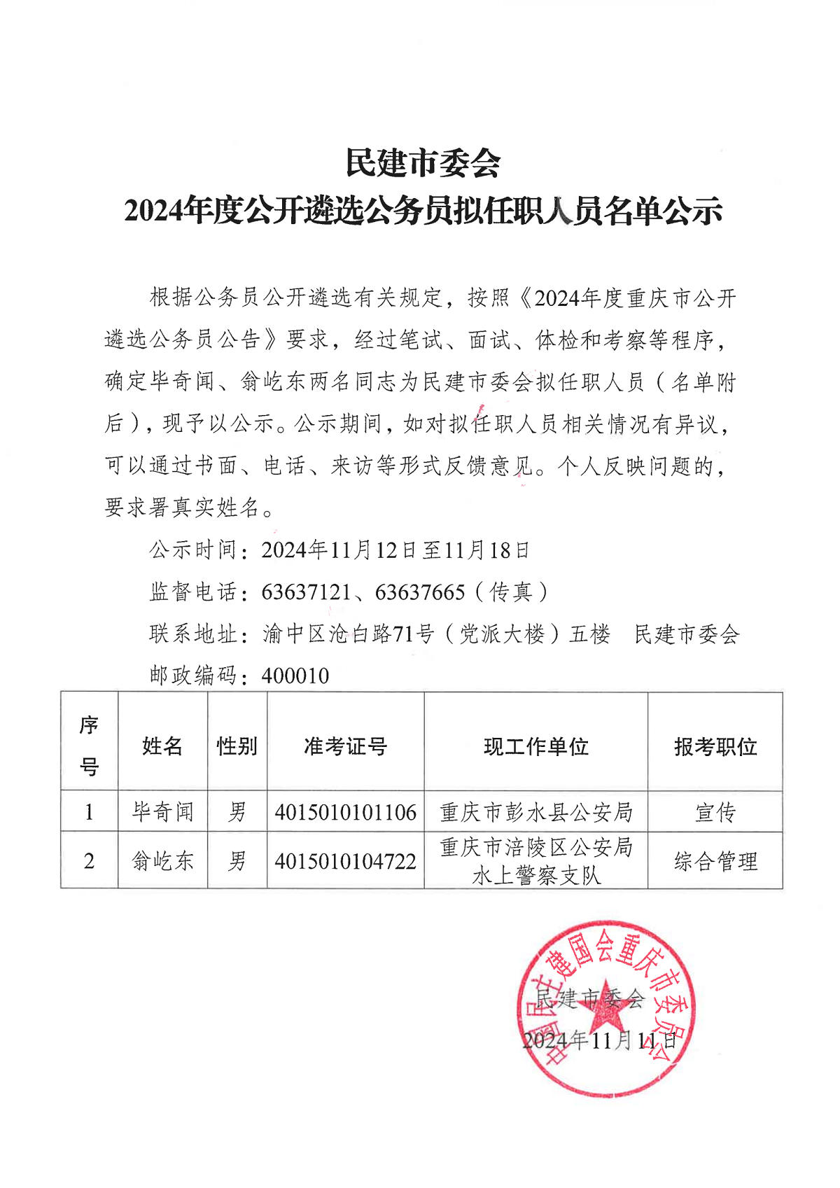 民建市委会2024年度公开遴选公务员拟任职人员名单公示